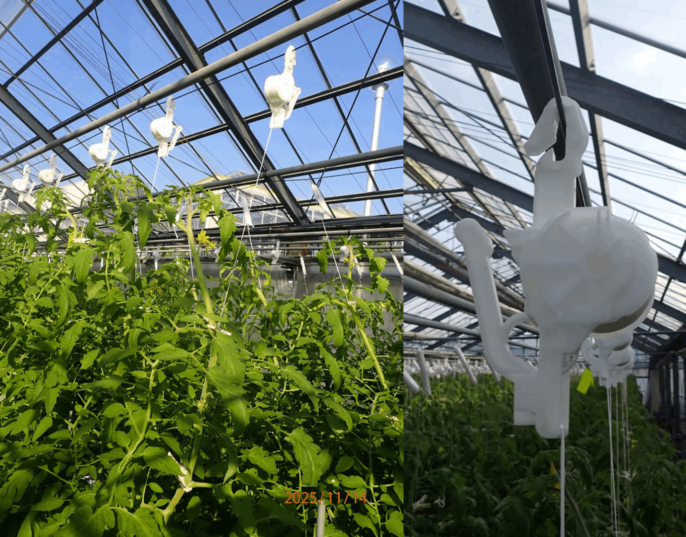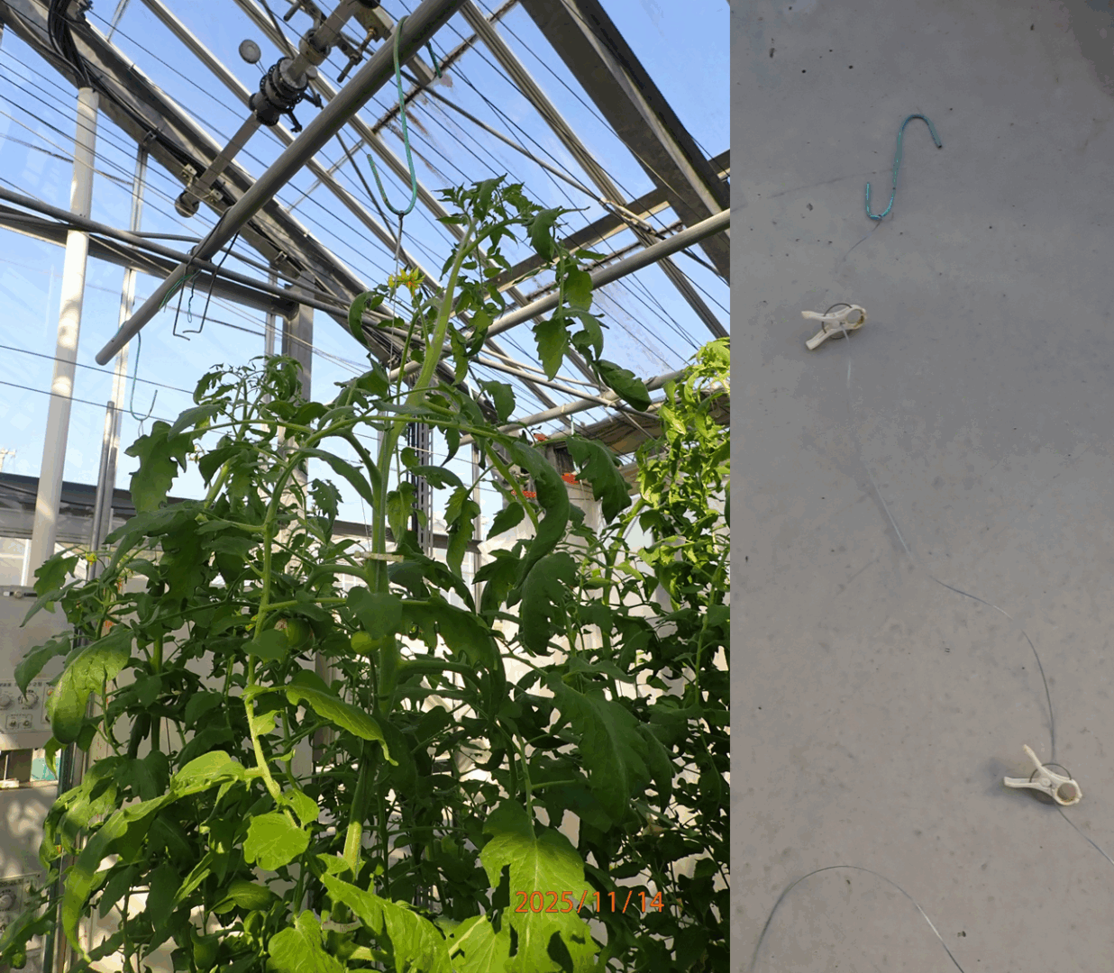 トマトの栽培本数が増えていることから、省力化ができないかと今年から新たに2つの誘引資材を試しています。